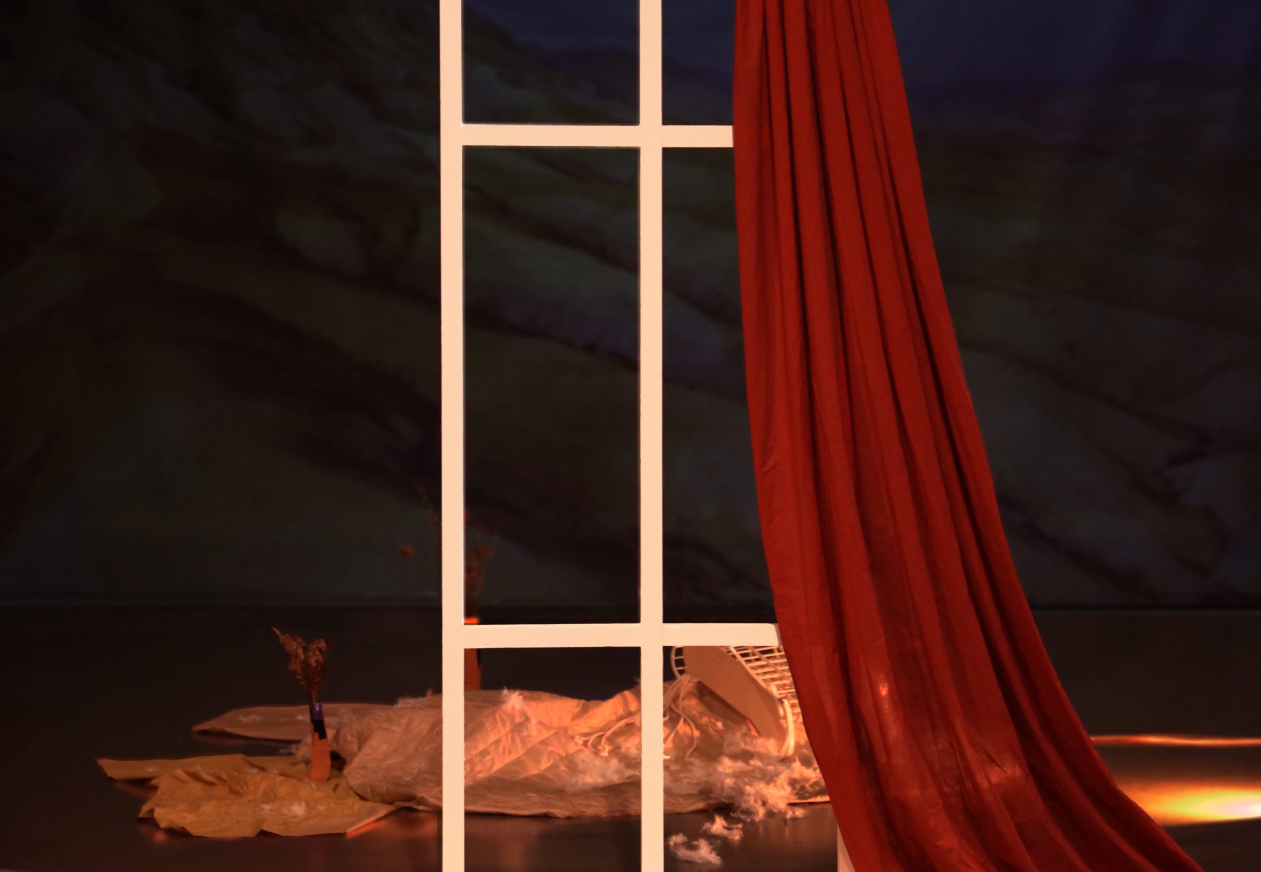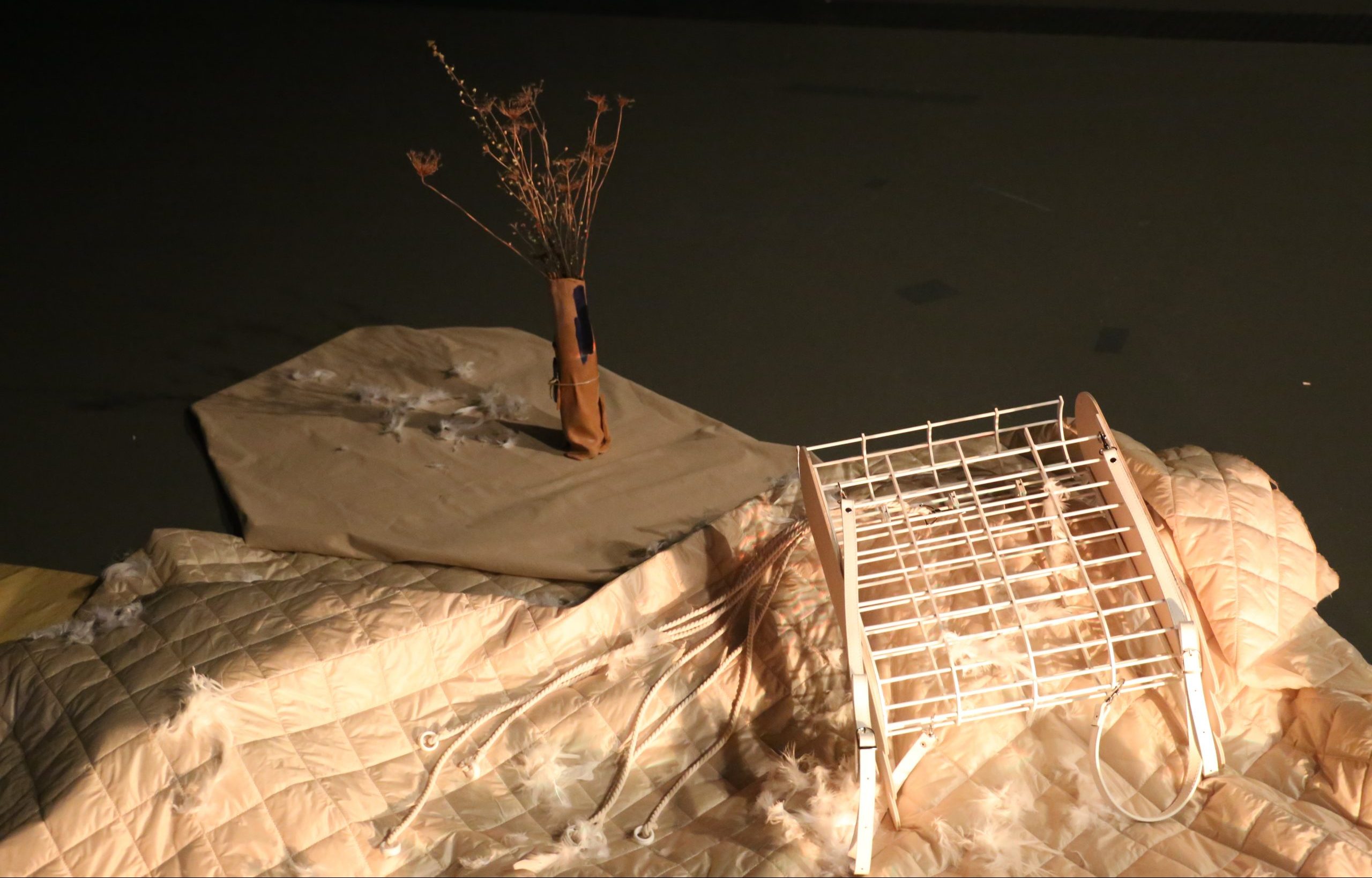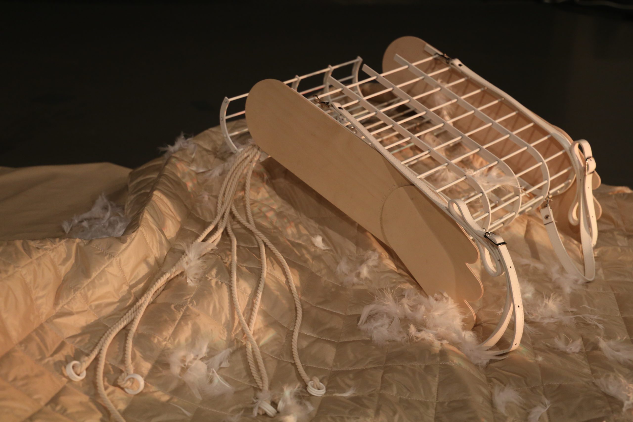 L’installation mêle le design d’objet, quelque chose du théâtre par son esthétique fragmentaire, — on entend la voix d’Icare résonner —, des plans de survol du désert en vidéo. Elle témoigne de la chute du personnage, en est le témoignage.