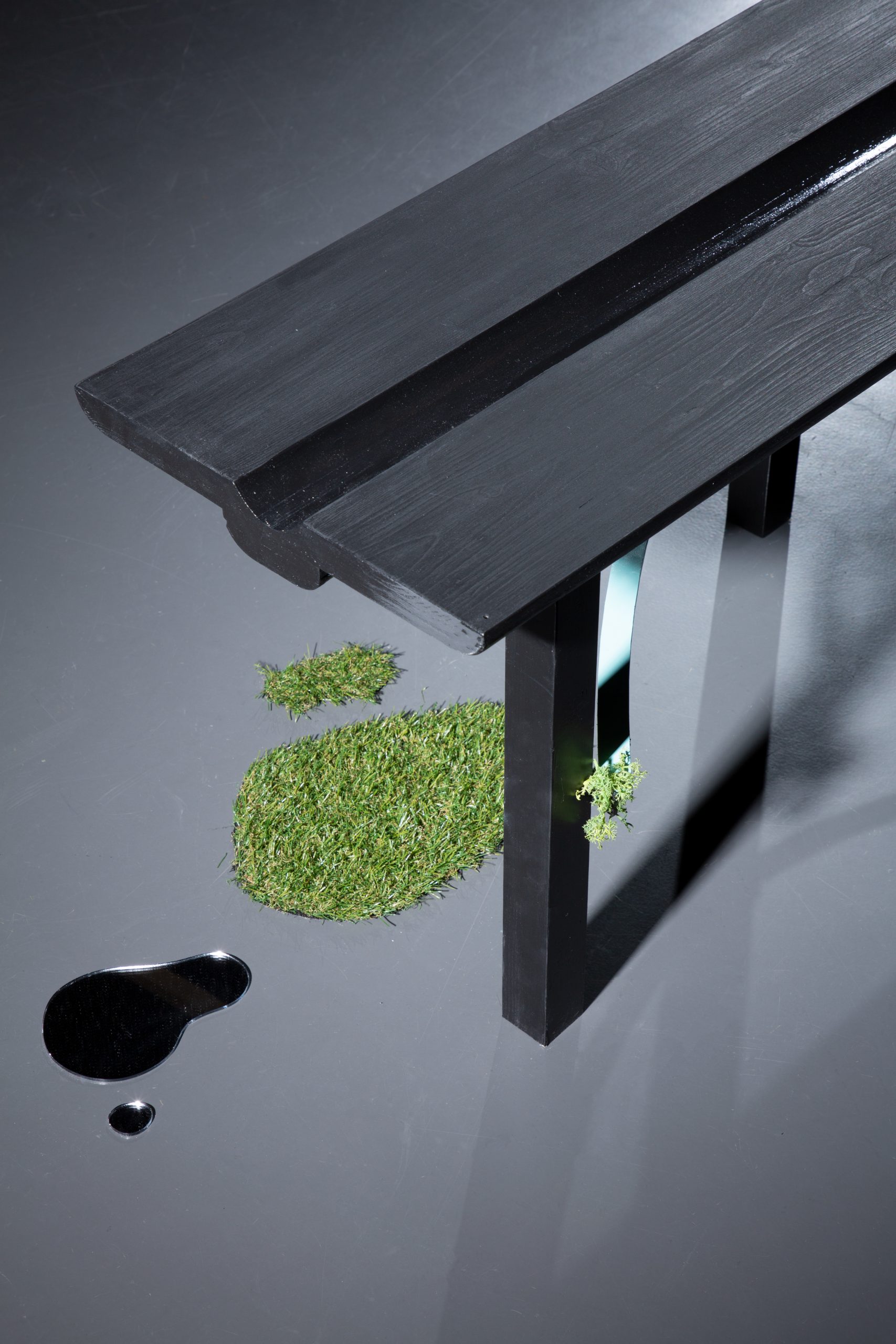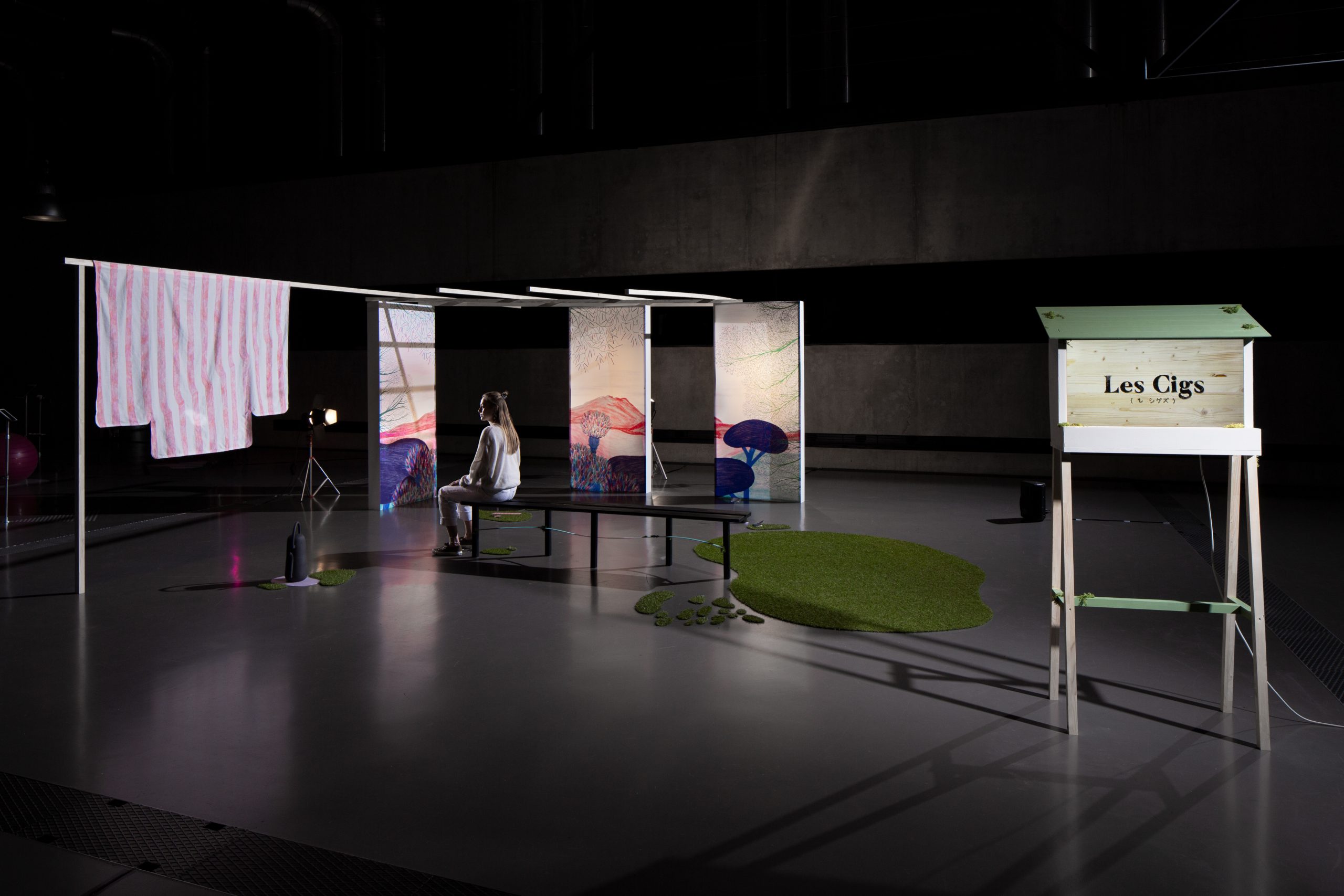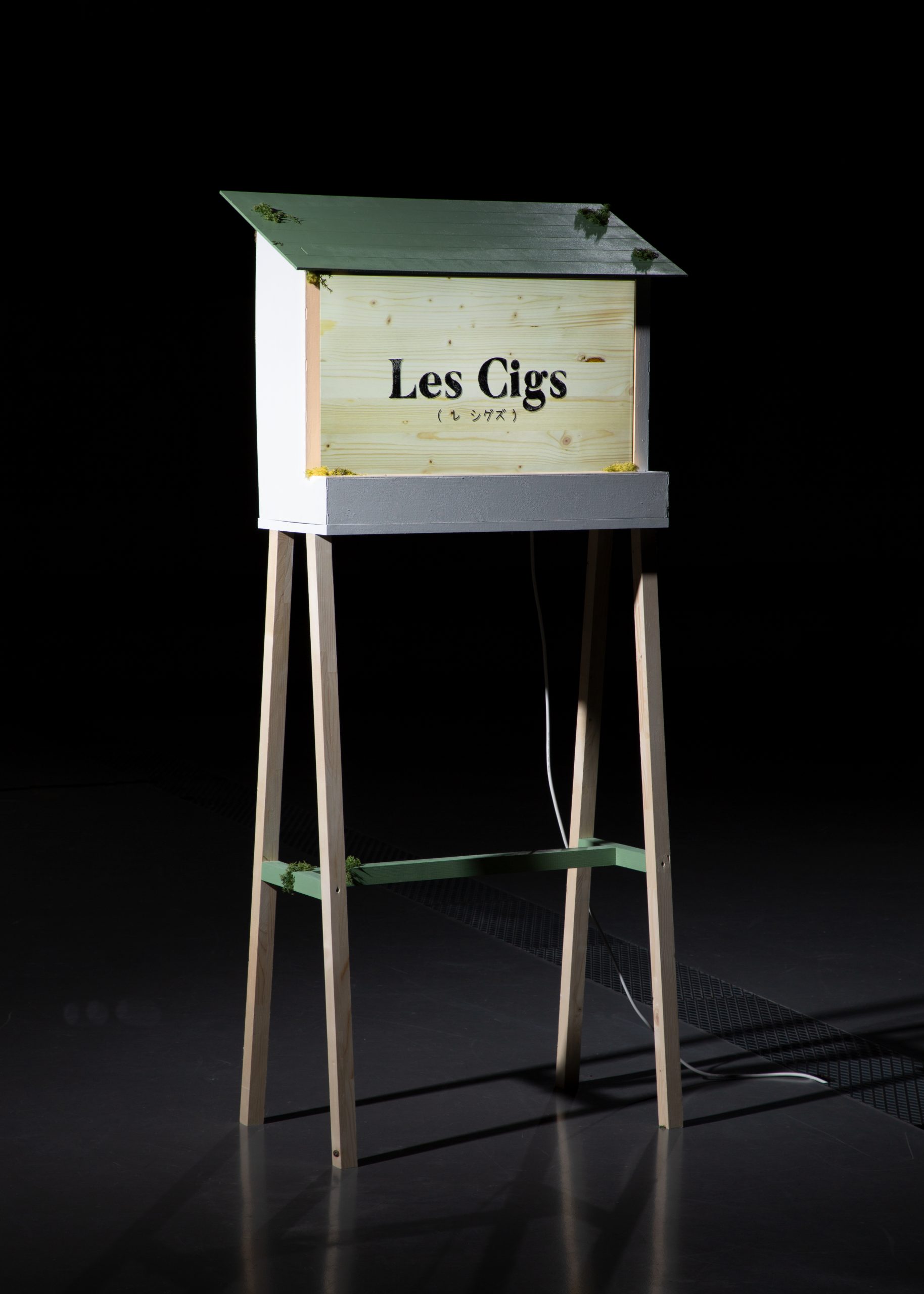 Pour Les Cigs, sept images qui forment un poème sont ainsi matérialisées dans l’espace de l’installation sous la forme d’objets. Le jardin dans lequel ces objets sont disposés se veut métaphorique. Il se situe dehors, mais dans un dehors qui ne signifie plus l’extérieur mais bien un hors ― hors d’un système trop rigide, rationnel, fonctionnel, voire, hors du monde.
