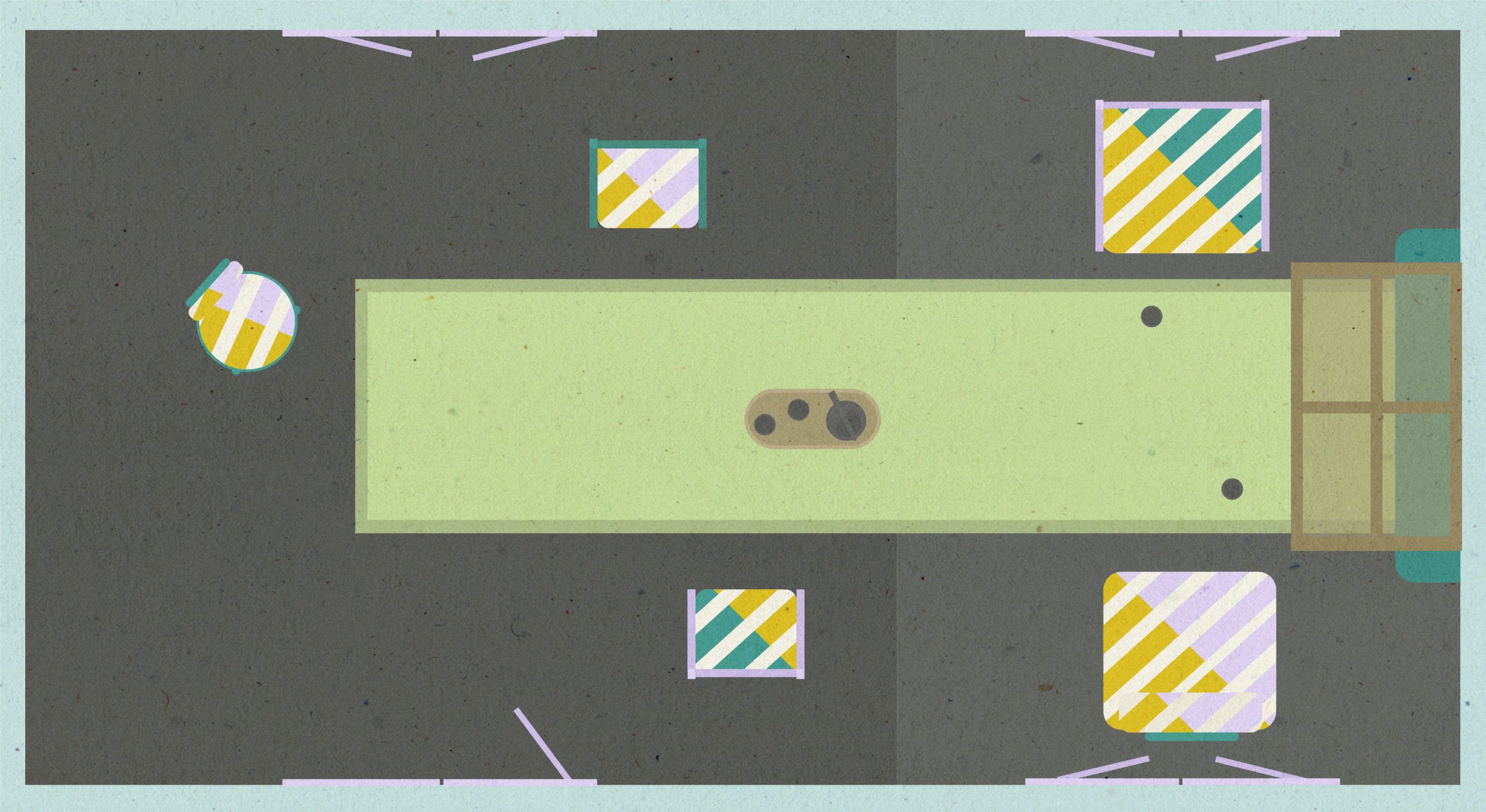 Cette salle à manger prend la forme d’un de ces patios certes typiques d’Afrique du Nord, mais que l’on retrouve disséminés dans toute la Méditerrannée. Les murs épais protègent de la chaleur plusieurs salons attenants, dont les portes toutes en jalousies évoquent le grillage fin d’un moucharabieh. Une longue table traverse la pièce, pourtant sur deux hauteurs : les chaises y côtoient les fauteuils bas. Le plateau repose sur de grandes jarres en terre qui semblent sentir encore l’huile d’olive qu’elles ont un jour contenue. Cachée derrière un passe-plat seulement entrouvert, la cuisine où doivent griller les légumes du soleil.