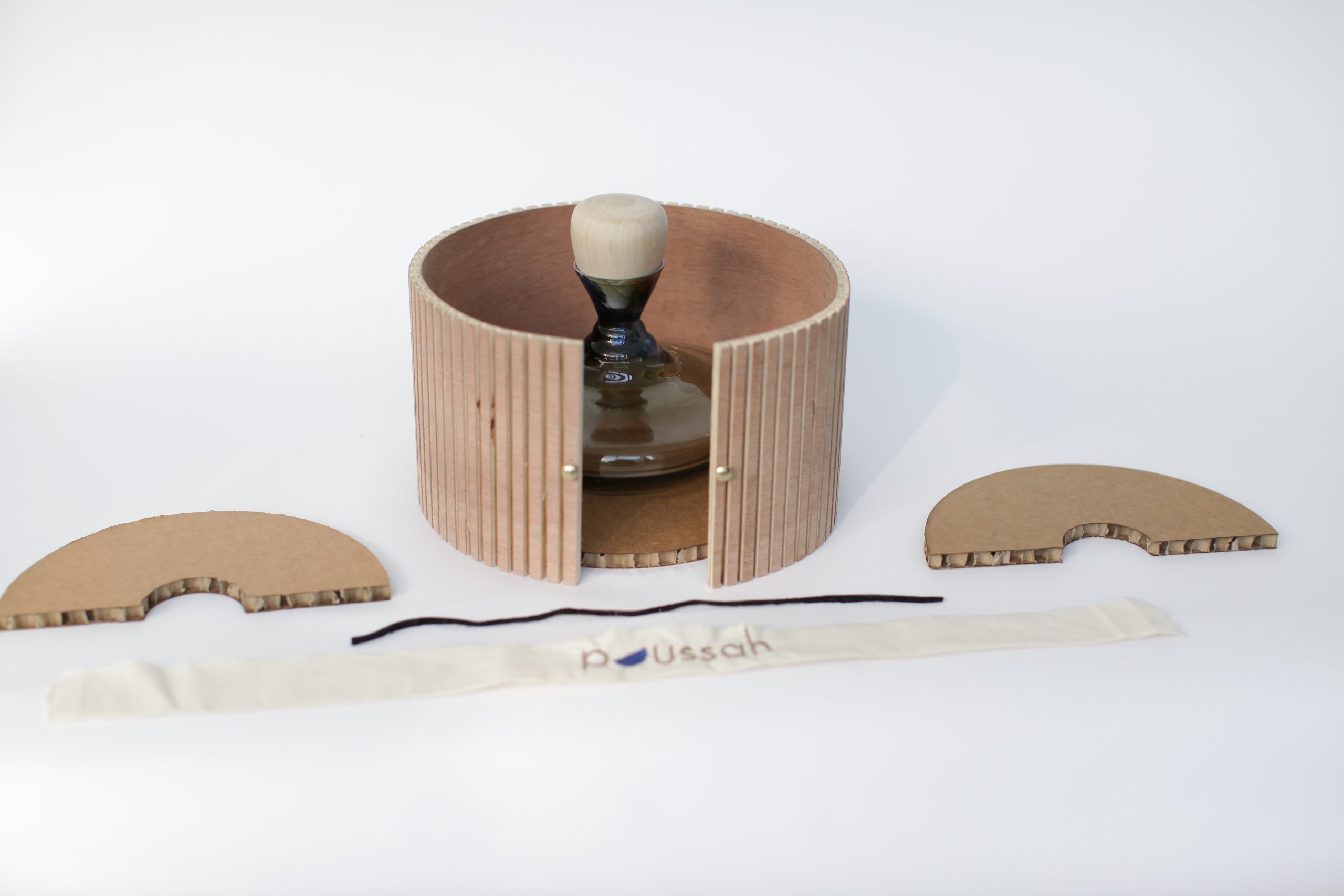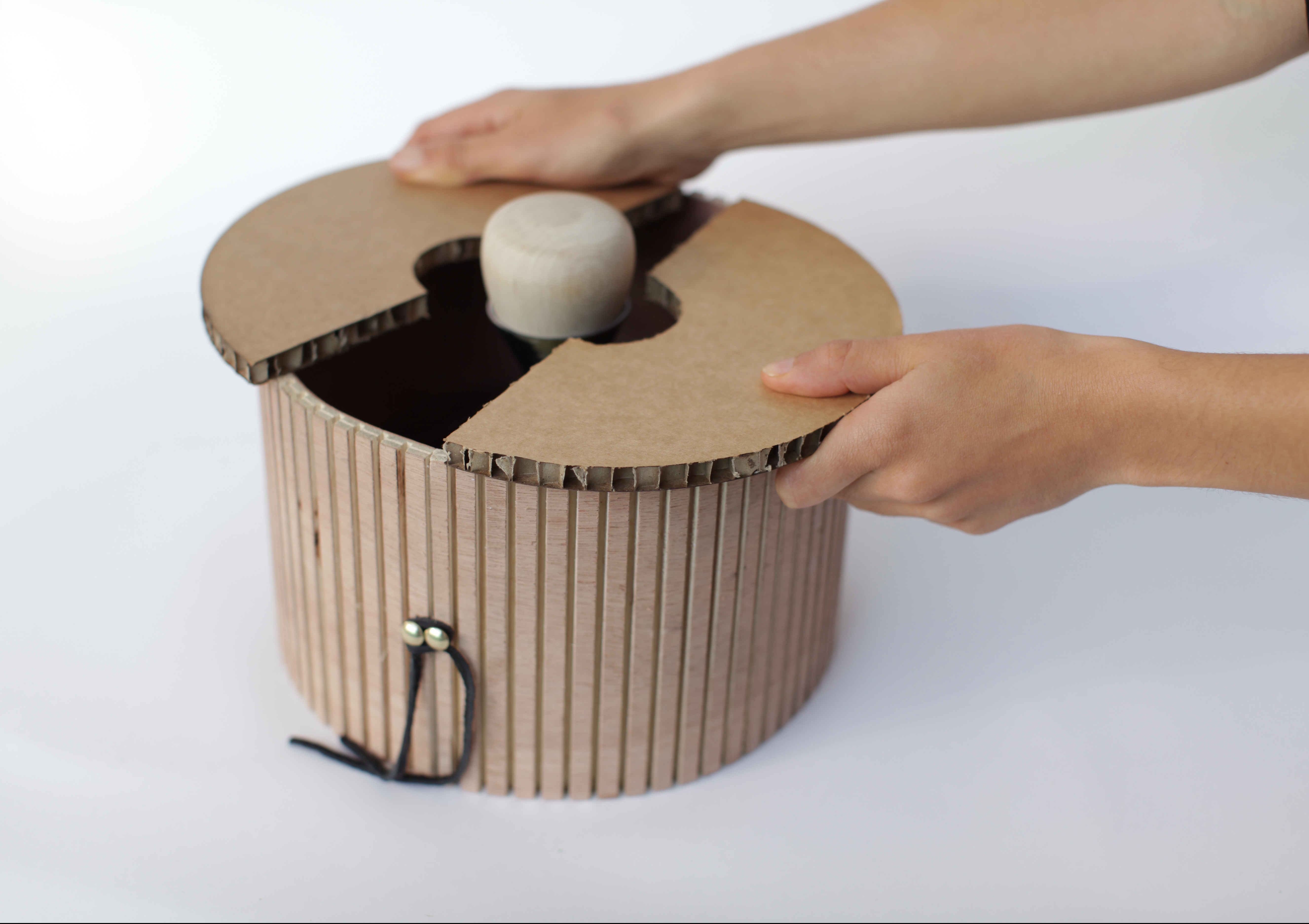 La poignée de la lampe Poussah dépasse du packaging et invite par sa rondeur. Une fois ouverte, la boîte se déroule en un chemin de table dont les rainures ralentissent le roulement de la lampe. Le reste de l’emballage, en carton alvéolé, est recyclable. Le logo, brodé sur un dustbag, reprend l’idée de bascule du poussah.